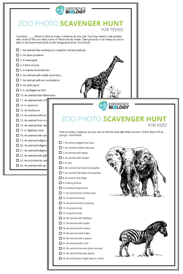 - Download the zoo photo scavenger hunt below — there’s a teen version and a younger kid version.